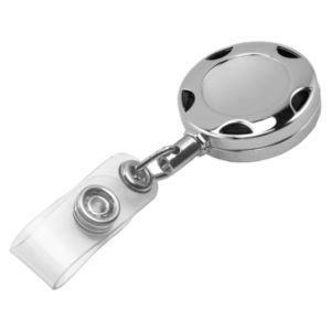 32" round, retractable badge holder with slip clip backing, made of chrome metal.