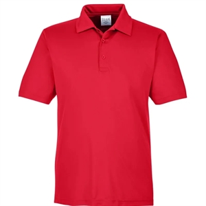 Men's polyester polo shirt with moisture wicking and UV protection, a three button placket and dyed-to-match buttons.