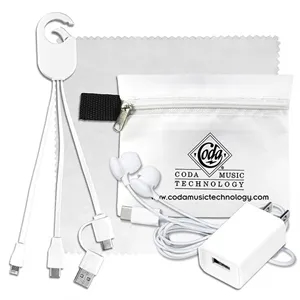 Tech kit with a microfiber cleaning cloth, wall charger, earphones, 5 pin charging cable and zipper pouch.