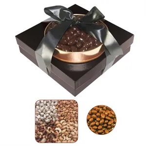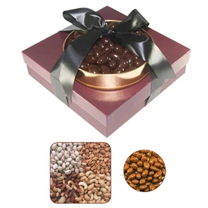 Tower of gourmet delights with a gift box and gold rush tray with a variety of nut treats