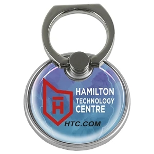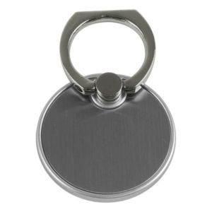 Metal rotating ring grip that doubles as a phone stand; features adhesive backing and customization.