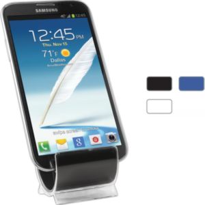 Cell phone and tablet stand holds devices in vertical or horizontal position.