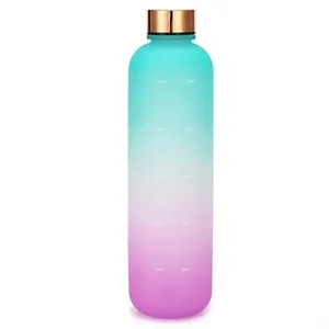 Gradient sports bottle with steel lid, time markers, and BPA-free plastic for leak-proof hydration tracking and portability.