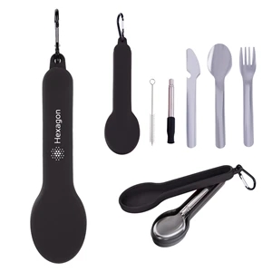 1.25" x 7.25" x 2" stainless steel fork, spoon and knife with collapsible straw, wire cleaning brush, silicone case and carabiner.
