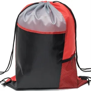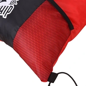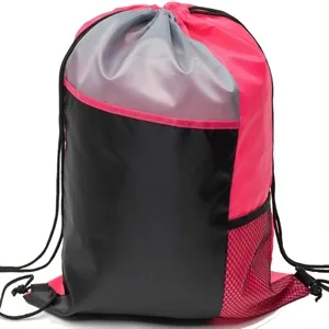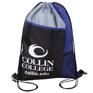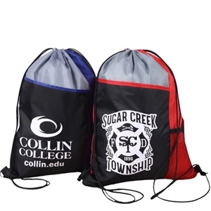 Sturdy 210D polyester. Vibrant tri-color design. Side mesh pocket. Bottom strap ear. 13"W x 17"H. Screen Print or Full-Color Trans