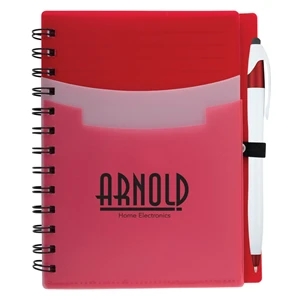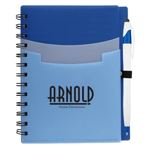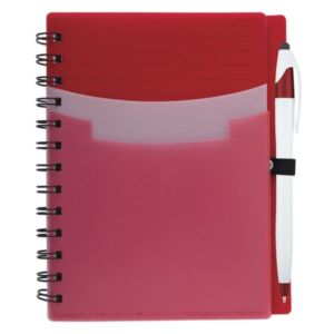 5" x 7" notebook with wire binding, 70 lined pages, polyurethane cover, elastic pen loop and three pockets on the front cover