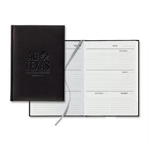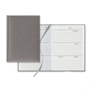 7" x 9 11/16" weekly planner with 192 pages and ribbon marker.