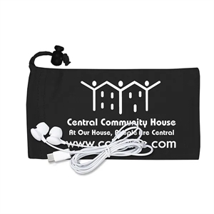 White plastic earbuds in 3 1/2" x 7" polyester cinched pouch.