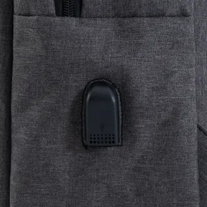 Polyester snow fabric backpack with pockets, shoulder straps, top handle, zippers, and USB port.