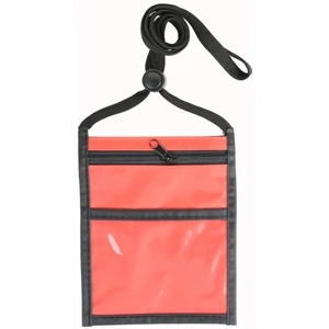Two tone front zipper neck wallet with 3/8" lanyard.