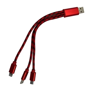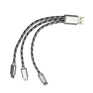 Trio charging cable with connectors for connecting to and charging various smartphones.