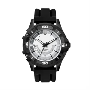 Customizable watch for men and women made with a 45mm brushed silver and black metal case and silicone rubber straps.