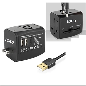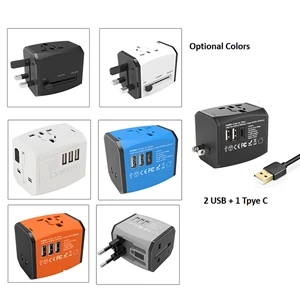 2.2" x 2.07" x 2.48" plastic and metal international travel power adapter with multiple USB ports for use in 150 countries.