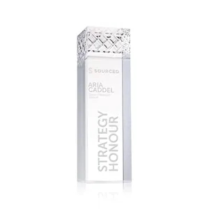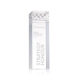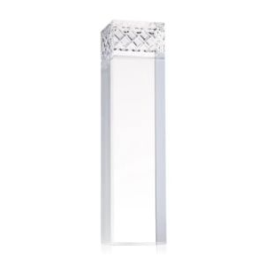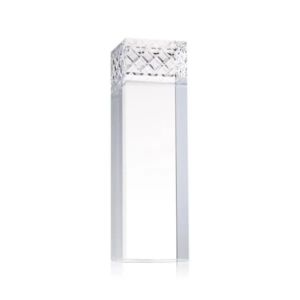 The Velson Award is a striking freestanding optical crystal piece with a tall rectangular column that conveys prestige.