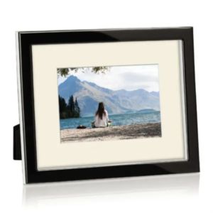 Molded ebony Lucite, polished to an ultra glossy shine, surrounds a wide matte for this elegant frame display