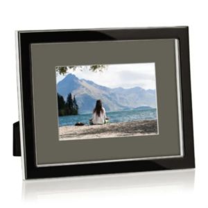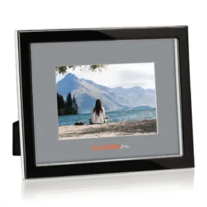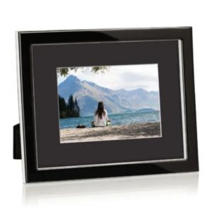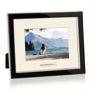 Molded ebony Lucite, polished to an ultra glossy shine, surrounds a wide matte for this elegant frame display