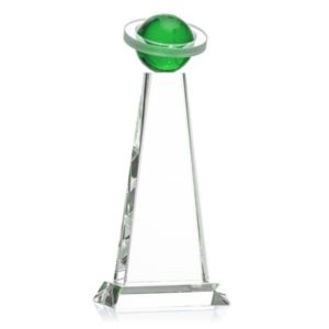 Tall optical crystal tower award topped with a clear globe and Saturn ring.