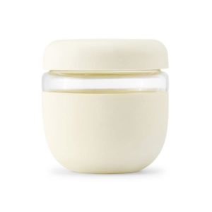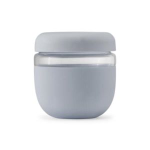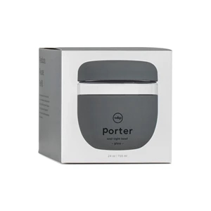 24 oz. borosilicate glass bowl wrapped in a protective matte silicone with seal-tight lid.