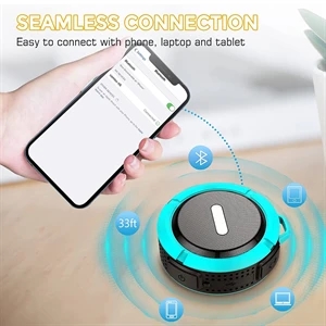 3.5" x 1.4" ABS plastic waterproof Bluetooth speaker with suction cup mount and carabiner clip.