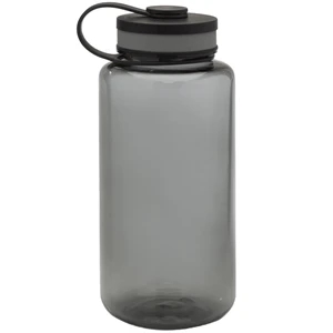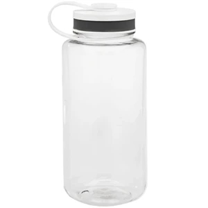 38 oz transparent plastic water bottle with wide mouth opening and screw-on cap.