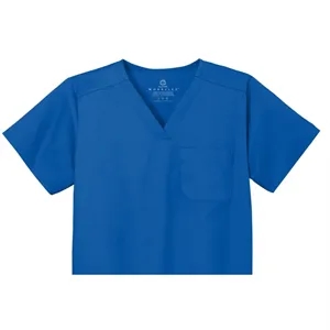Unisex top with a V-neckline, badge loop, left chest pocket, pen slot, and side vents.