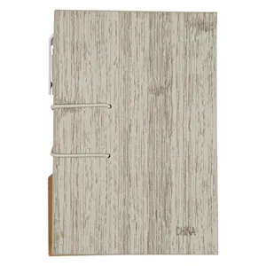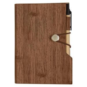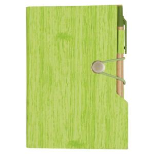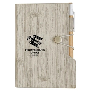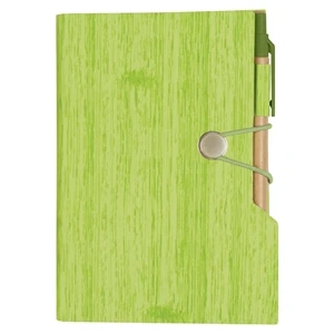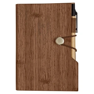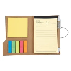 Notebook with a woodgrain look that has sticky notes, tape flags, a matching pen and a 70-page lined note pad