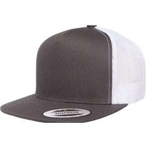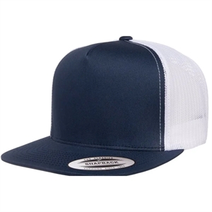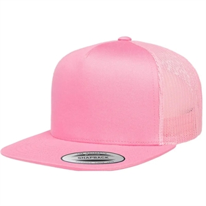 5 panel trucker cap with plastic adjustable closure.