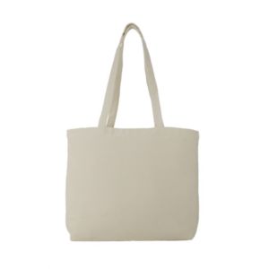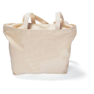 18"L x 13"H x 5"W tote bag made of 12 oz. cotton canvas with zippered gusset top and 30" shoulder straps.