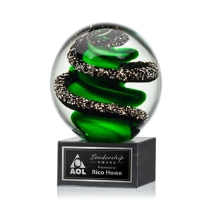 Magnificent Striking Zodiac Art Glass Award features twisting ribbons of emerald and glimmering black speckles