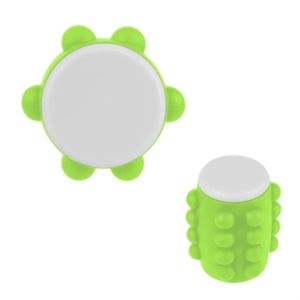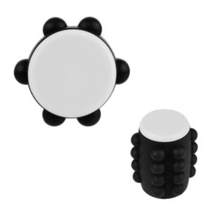 Push-pop, spinning fidget toy made of silicone and recycled ABS.